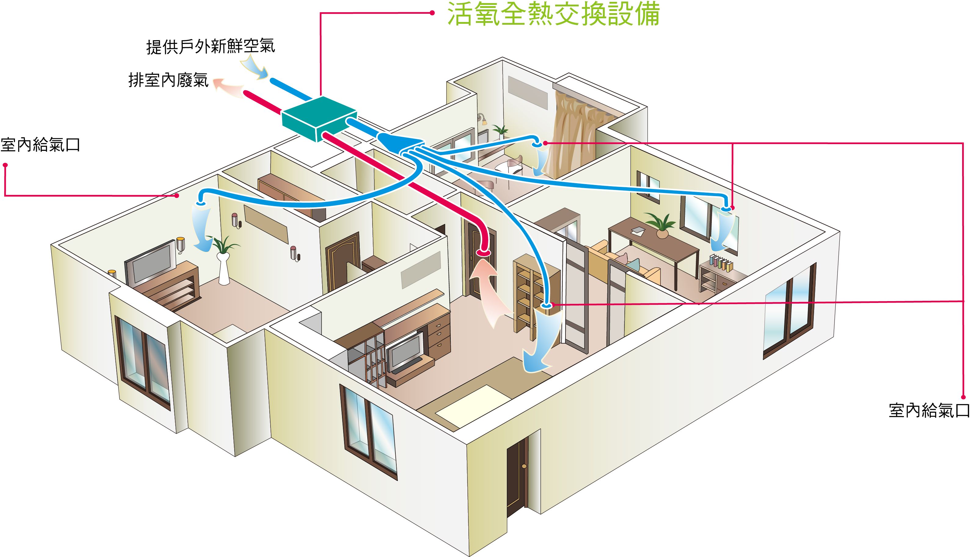 目前,我國新風(fēng)產(chǎn)品還沒有國家標(biāo)準(zhǔn)。在這種情況下,教室為何要安裝新風(fēng)而非空氣凈化器?河北省潔凈行業(yè)協(xié)會會長宋建立教授解釋說,學(xué)生在教室里上課,門窗緊閉,室內(nèi)二氧化碳濃度會快速上升??諝鈨艋髂芪絇M2.5、甲醛等污染物,但是對封閉空間內(nèi)的空氣進(jìn)行內(nèi)部循環(huán),無法解決增氧和二氧化碳問題。新風(fēng)系統(tǒng)將室外新鮮氣體經(jīng)過濾、凈化、增氧、調(diào)溫等處理后通過管道輸送到室內(nèi),并把室內(nèi)污濁空氣排出到室外,通過室內(nèi)外空氣置換來實現(xiàn)室內(nèi)空氣潔凈,解決健康需求。